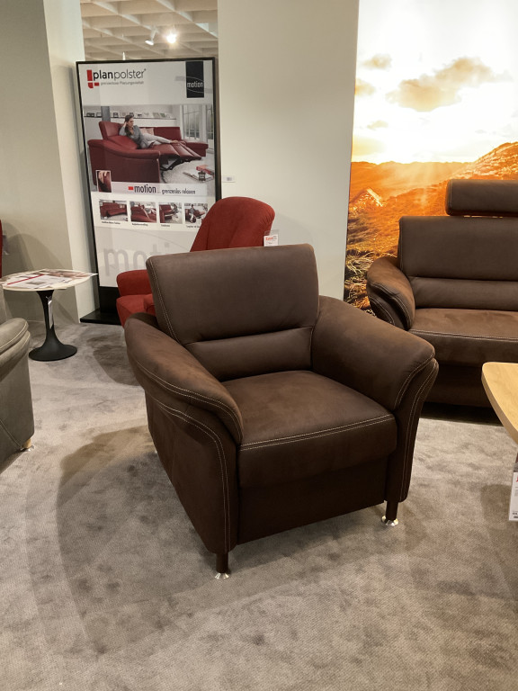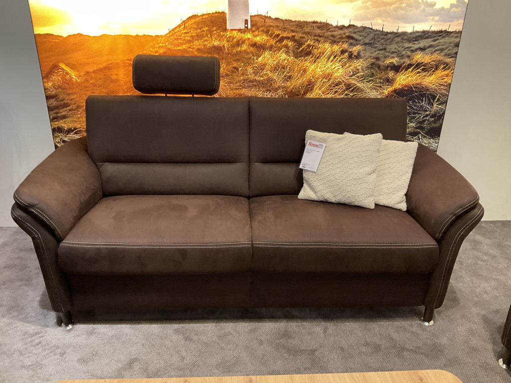 Bezug Microfaser DeLuxe Espresso, Kontrastnaht beigeBoxspringsitz Sitzhöhe ca. 49+2 cmHolzfuß antikbraunincl. 2 Kopfstützen und 3 Extra-Kopfstützvorrichtungen