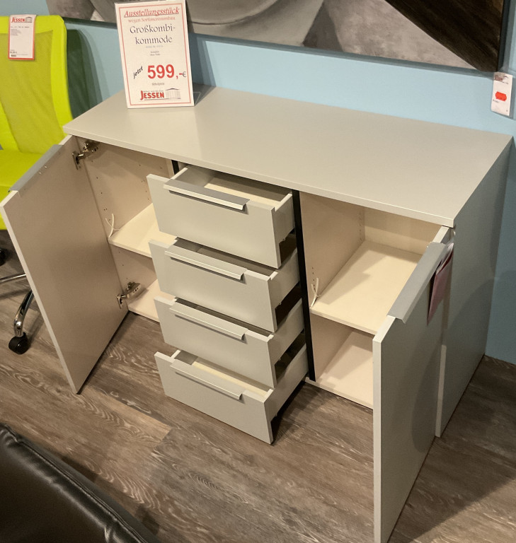 Korpus: Dekor HeligrauFront: Dekor HellgrauInnendekor: TextlineGriffleiste: alufarbig2 Türen und 2 Schubkästen B/H/T ca. 120 x 88 x 40cm