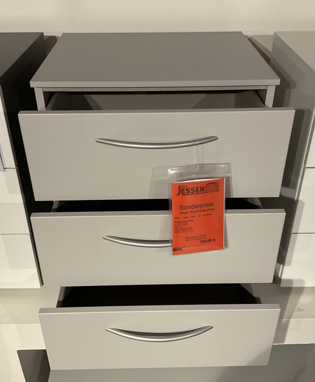 Typ: A028P.6D36 mit 3 SchubkästenGriff: P AluFront: Seidengrau DekorKorpus: Seidengrau DekorB/H/T ca. 50 x 61 x 42 cm