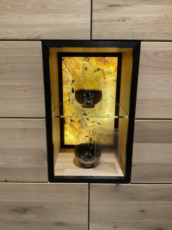 Asteiche bianco massiv geölt B/H/T: ca. 120 x 120 x 40 cmRückwand- Akzent Schiefer hinterleuchtet