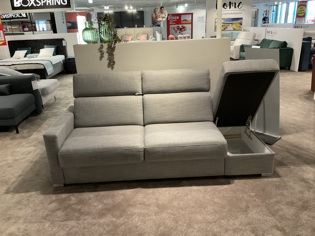 Anbauhocker rechts, Faltsofa links Bezug 2-6086 Armlehne: Typ 1 mit 2 Kopfstützen Matratze: Kaltschaum 11 cm Füße: Chrom В/Н/T са. 228 x 87 - 101 x 97 0m Liegefläche 150 x 200 cm